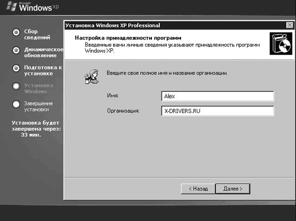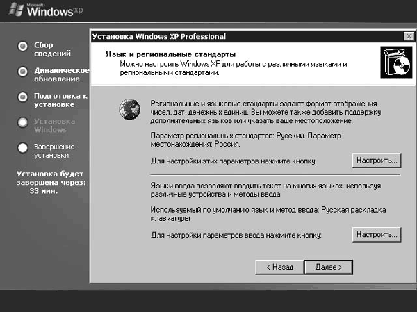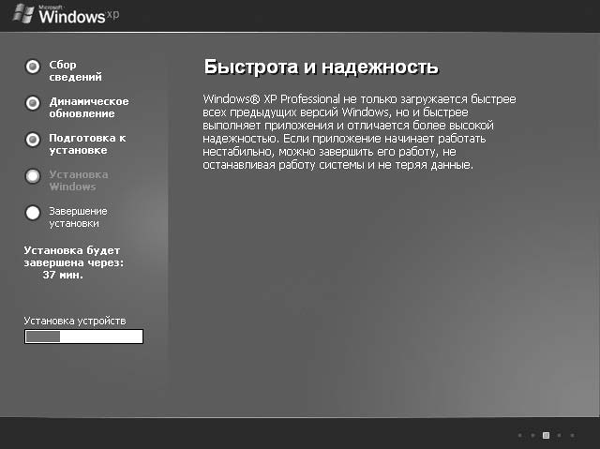Итак, графический этап установки Windows XP (рис. 7.9) начинается с определения и установки драйверов для устройств компьютера (в нашем случае ноутбука) и копирования всех остальных файлов, необходимых для корректной работы системы. После этого останется только настроить Windows в соответствии с вашими предпочтениями. Во время графического этапа вам также не нужно ничего делать.