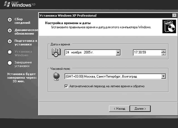 Следующим этапом установки является настройка даты и времени (рис. 7.13).