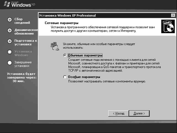 Они необходимы для работы ноутбука в составе какой-либо сети (проводной или беспроводной). Мы оставляем настройку по умолчанию – Обычные параметры. После окончания установки Windows сеть работать не будет, но ее можно настроить позже. О том, как это сделать, подробно рассказывается в гл. 24 и 25.