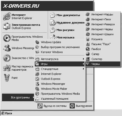 Его можно вызвать, нажав кнопку Пуск, которая расположена в левом нижнем углу экрана (либо нажав клавишу Windows). В меню Пуск есть большое число пунктов, содержащих собственные подменю. К часто используемым можно отнести Все программы. При наведении на него указателя мыши откроется список установленных приложений. Внутри этого списка могут быть пункты со своими подменю. В данном случае щелчок кнопкой мыши вызовет выбранную программу, но не изменит содержимое какого-либо окна. Подробнее о меню Пуск можно прочесть в гл. 10.