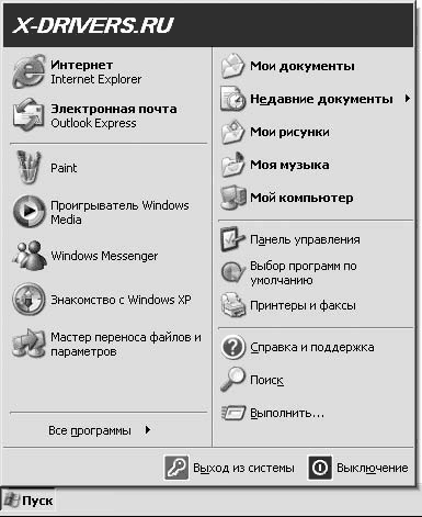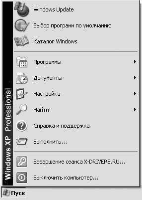 Классическое меню Пуск (рис. 10.13) выглядит более просто. Здесь доступны только пункты для выхода из Windows и смены пользователя (подробнее об этом читайте в гл. 13), некоторые системные функции (Справка и поддержка, Выполнить, Найти), список последних документов, а также список установленных программ (пункт Программы). Вверху могут находиться ярлыки программ, которые вы запускаете чаще всего.