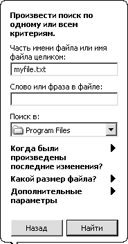 Далее необходимо задать критерии поиска (рис. 11.6). Прежде всего в первом поле указывается имя файла (полное или частичное). Для более точного поиска можно задать маску.