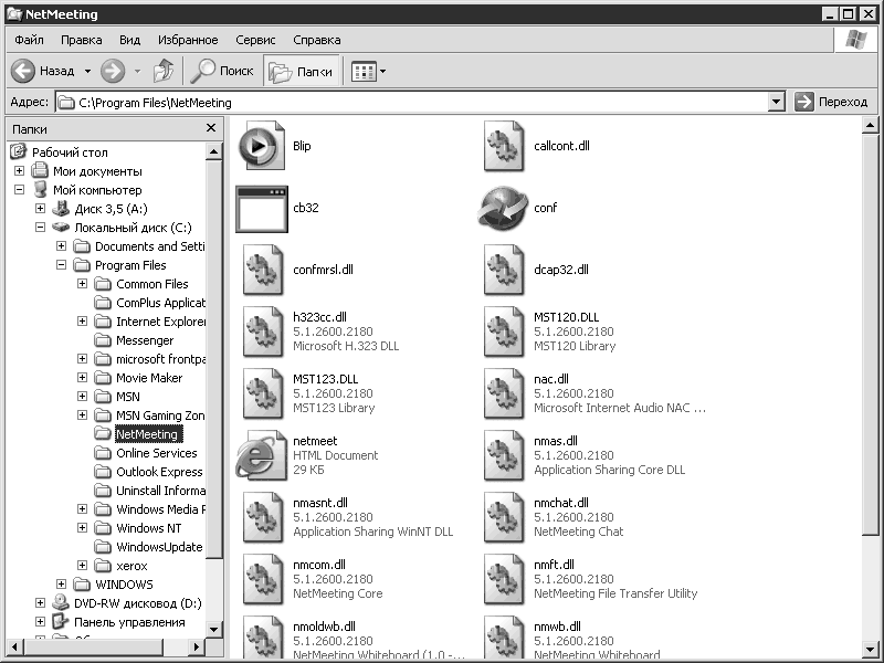 Оно вызывается нажатием кнопки Папки на панели инструментов. Структура носителей, подключенных к вашему компьютеру, отображается в виде дерева. Если у какой-либо папки есть вложенные папки, то рядом с ней появляется +. Щелкнув на нем кнопкой мыши, вы откроете список с вложенными объектами, а + заменится на —. Если щелкнуть кнопкой мыши на любой из папок в дереве, то справа отобразится их содержимое.