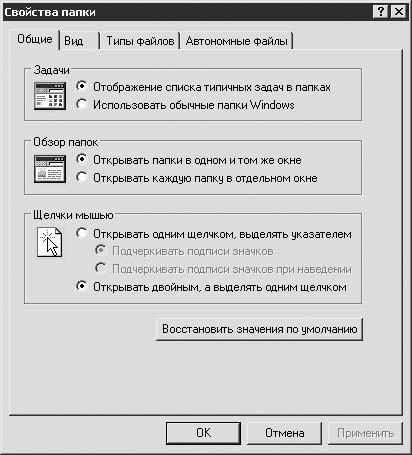 Окно Свойства папки (рис. 11.10) состоит из четырех вкладок: Общие, Вид, Типы файлов, Автономные файлы.