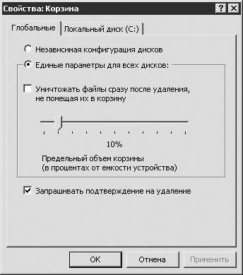 Если вы не хотите постоянно удалять файлы из Корзины, а также уверены, что не удалите какой-либо файл случайно, можно включить прямое удаление с жесткого диска. Для этого нужно войти в свойства Корзины через контекстное меню, вызываемое щелчком правой кнопки мыши на ее значке (рис. 11.16).