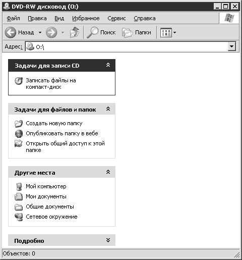 Прежде чем перейти к flash-памяти, отмечу несколько нюансов при работе с дисками. Если в Проводнике вы дважды щелкнете кнопкой мыши на значке оптического привода, когда в нем нет диска, то он откроется, однако внутри будет пусто (рис. 12.2).