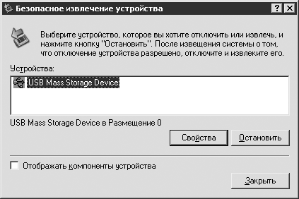 Делается это через окно Безопасное отключение устройства, вызываемое через Панель задач (подробнее о ней рассказывается в гл. 10) щелчком кнопки мыши на значке с зеленой стрелкой (рис. 12.4).