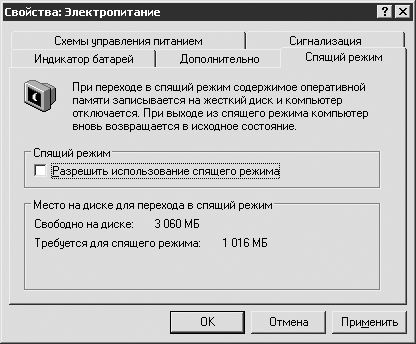 Спящий режим описан выше. Его настройка производится на одноименной вкладке (рис. 13.13). По умолчанию он отключен. Это можно изменить, установив флажок Разрешить использование спящего режима.