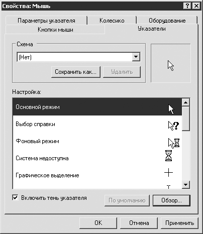 В списке Настройка отображаются текущие указатели для всех состояний. Выделив один из них и нажав кнопку Обзор, можно сменить внешний вид указателя, выбрав соответствующий файл. Установка флажка Включить тень указателя предполагает наличие под указателем «мягкой» тени.