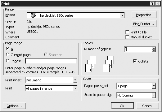 Для вывода на печать в любой программе с поддержкой данной функции нажмите кнопку с принтером на панели инструментов или выберите соответствующий пункт меню (обычно Файл -> Печать). После этого либо сразу начнется печать, либо появится диалоговое окно, позволяющее задать особые параметры. На рис. 15.8 показан пример такого окна для известного редактора Microsoft Word.