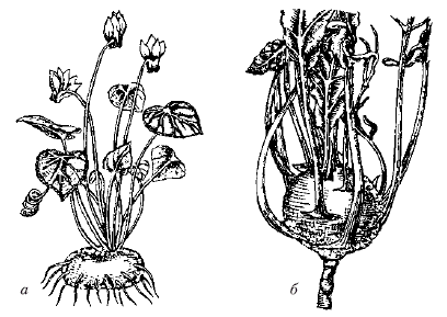 Подземный гипокотильный клубень цикламена (а) и надземный клубень капусты кольраби, образовавшийся в результате локального утолщения стебля главного побега (б)