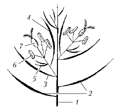 Колосок пшеницы: 1 – ось колоска; 2 – колосковые чешуи; 3 – нижняя цветковая чешуя; 4–7 – цветок (4 – верхняя цветковая чешуя, 5 – лодикулы, 6 – тычинка, 7 – пестик)