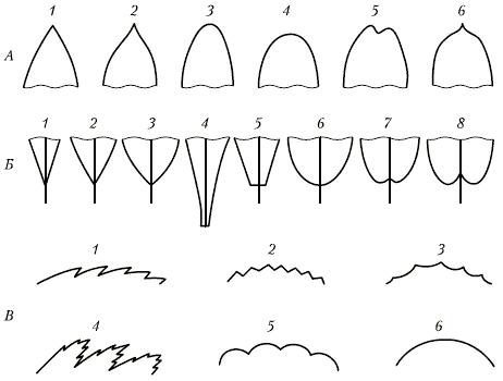Разнообразие форм верхушки, основания и края листовой пластинки: А – верхушка: 1 – острая; 2 – оттянутая; 3 – туповатая; 4 – округлая; 5 – выемчатая; 6 – с остроконечием; Б – основание: 1 – узкоклиновидное; 2 – клиновидное; 3 – ширококлиновидное; 4 – нисбегающее; 5 – усеченное; 6 – округлое; 7 – выемчатое; 8 – сердцевидное; В – край: 1 – пильчатый; 2 – зубчатый; 3 – выемчатый; 4 – двоякопильчатый; 5 – городчатый; 6 – цельный