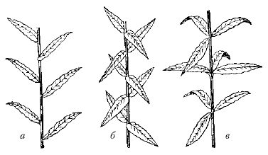 Типы листорасположения: а – очередное; б – супротивное; в – мутовчатое