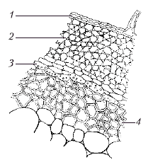 Колленхима и склеренхима в стебле тыквы: 1 – эпидерма; 2 – уголковая колленхима; 3 – крахмалоносное влагалище; 4 – склеренхима