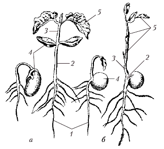 Надземное у фасоли (а) и подземное у гороха (б) прорастание семян: 1 – главный корень; 2 – гипокотиль; 3 – эпикотиль; 4 – семядоли; 5 – первые листья главного побега