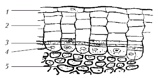 Перидерма на поперечном срезе стебля бузины: 1 – эпидерма; 2–4 – перидерма (2 – феллема, 3 – феллоген, 4 – феллодерма); 5 – хлоренхима