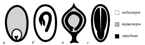 Типы семян в зависимости от места отложения в них запасных питательных веществ: а – семя кубышки с эндоспермом и периспермом; б – семя томата с эндоспермом; в – семя шпината с периспермом; г – семя льна без эндосперма и перисперма (запасные вещества – в семядолях зародыша)