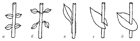 Типы листьев в зависимости от характера их сочленения с узлом стебля: а – сидячий; б – черешчатый; в – низбегающий; г – полустеблеобъемлющий; д – стеблеобъемлющий