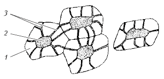 Склереиды плода груши: 1 – одревесневшая клеточная стенка; 2 – протопласт; 3 – поровые каналы