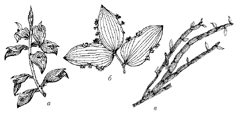 Филлокладии иглицы подъязычной (а) и семелы двуполой (б); кладодий мюленбекии плосковеточной (в)