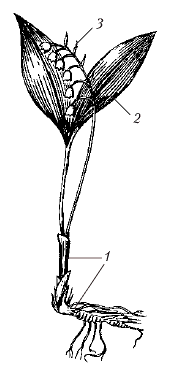 Формации листьев у побега ландыша: 1 – низовая (катафиллы); 2 – срединная (фотосинтезирующие листья); 3 – верховая (брактеи)