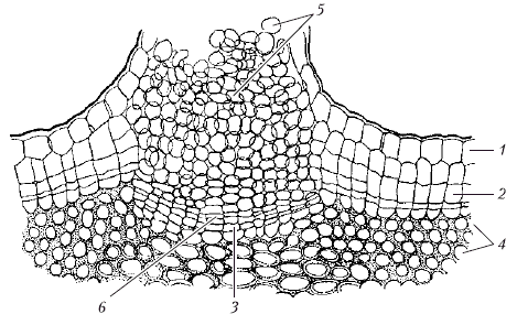 Чечевичка перидермы бузины осенью: 1 – эпидерма; 2 – феллема; 3 – феллоген; 4 – феллодерма; 5 – выполняющая ткань чечевички; 6 – замыкающий слой феллемы