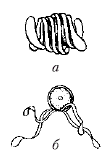 Элатеры спор хвоща: а – в закрученном виде; б – в раскрученном виде