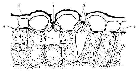 Эпидерма листа лука-порея на поперечном срезе: 1 – основные клетки; 2 – замыкающие клетки устьица; 3 – устьичная щель; 4 – подустьичная полость; 5 – кутикула
