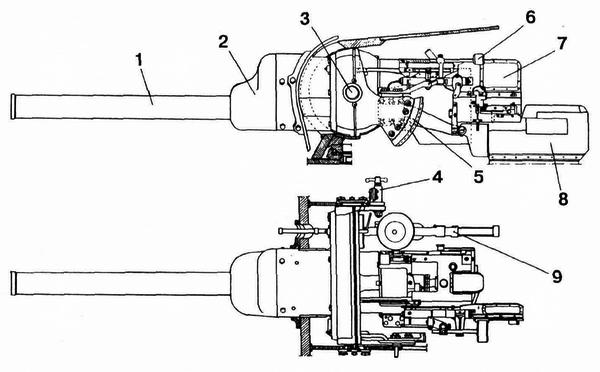 1 — чашечка; 2 — прицел; 3 — державки телескопа; 4 — линейка указателя отката; 5 — лобовой упор; 6 — наглазник; 7 — маховичок боковых поправок; 8 — маховичок углов прицеливания; 9 — рычаг спуска; 10 — сектор подъёмного механизма; 11 — ручка маховичка.