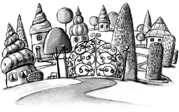 Это место и правда было как будто нарисованное. Маленькие цветные домики с удивительной формы крышами, больше похожими на ракушки, чем на крыши. Посреди дороги ажурные ворота, но почему-то без забора. Да-да, одни ворота! Ни к чему не прикрепленные, стоят сами по себе у входа в этот «городок».