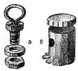 Водоналивное отверстие (рис. 79, а) лучше всего завинчивать гнездом от радиоприемника или от старого штепселя. К крышке котла припаяйте гайку гнезда. В головку гнезда впаяйте проволочное кольцо: им будет удобно завинчивать гнездо. Когда будете впаивать кольцо, запаяйте совсем отверстие.