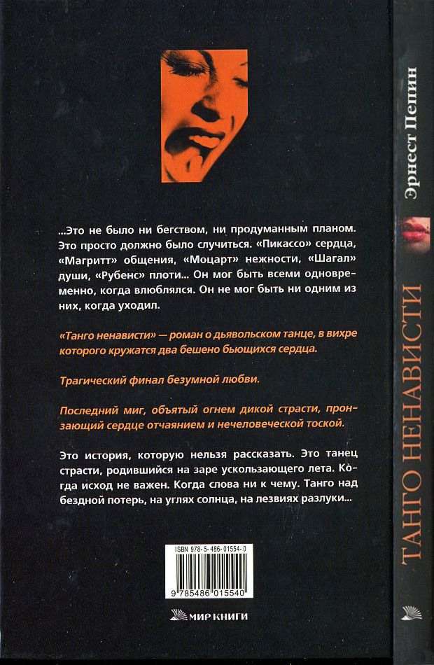 Я знаю, что моя борьба не имеет смысла для вас, ведь я не стремлюсь завоевать вас вновь. Я просто пытаюсь восстановить саму себя. Иногда я уже сама не понимаю, чего я хочу. Слепая, как сама судьба, я танцую. Вы ведь раньше любили танцевать? Ну вот, я танцую безысходность… В полном одиночестве. Я танцую печальное танго брошенной женщины. Я танцую на углях солнца, на лезвиях разлуки, на танцплощадке грустных мыслей, грустных, как увядшие цветы. Я танцую, честное слово, я хорошо танцую танго ненависти!