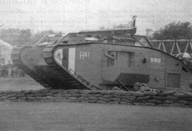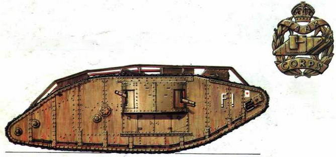 Тяжелый танк Mk IV "самка". 6-й (F) батальон Танкового корпуса. Сражение у Камбрэ, ноябрь 1917 года. Эмблема Танкового корпуса.