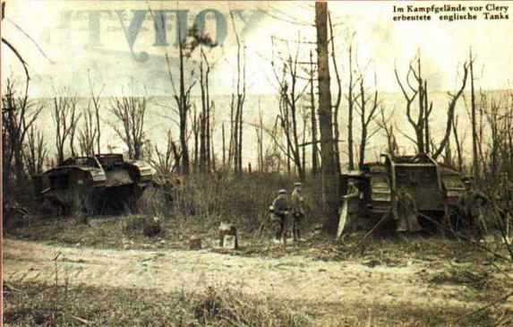 Английские танки Mk IV, захваченные на поле боя у Клери, ноябрь 1917 года.