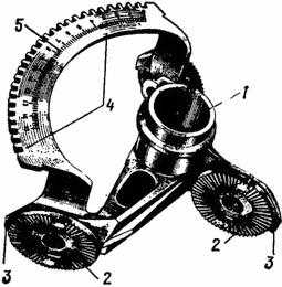 1 — стакан; 2 — зубчатые шайбы; 3 — выступы для фиксации ног; 4 — горизонтальный сектор; 5 — угломерная шкала