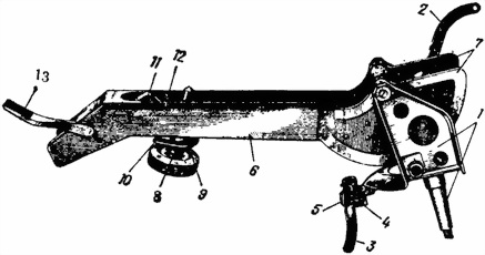 а — с механизмом тонкой наводки; б — упрощенный (без механизма тонкой наводки); 1 — вертлюг; 2 — сектор; 3 — рама; 4 — держатель; 5 — гнльзоулавлнватель; 6 — плечевой упор; 7 — механизм тонкой наводки; 8 — рукоятка стопорного болта для закрепления сектора; 9 — передней ползун; 10 — амортизатор; 11 — задней ползун; 12 — засовы; 13 — захваты