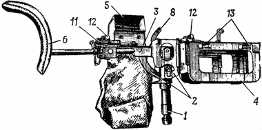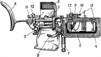 1 — вертлюг; 2 — рукоятка стопорного болта зажима вертикальной наводки; 3 — рукоятка стопорного болта зажима горизонтальной наводки; 4 — полочки; 5 — указатель; 6 — рама; 7 — секторы рамы; 8 — винт с маховнчком и прицельным кольцом механизма тонкой наводки; 9 — разрезная гайка; 10 — вороток зажимного винта; 11 — механизм закрепления тела пулемета; 12 — крюк; 13 — рукоятка