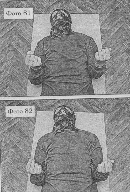 ми подреберья, захватите энергию в правый и левый кулаки одновременно (фото 81) и резко дерните локти обеих рук вниз, как бы вырывая что–то из области печени и желчного пузыря и из области селезенки и поджелудочной железы (фото 82).