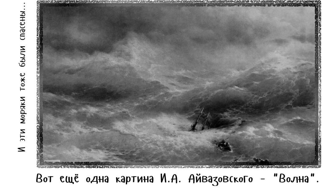 — Иноверцы — это люди другой веры, - пояснил юнга. Ведь у нас, турок, и у вас, русских, — веры разные. Вам своих святых лучше знать: вам они чаще помогают. Да теперь я и сам в этого святого старичка верю: ведь он нас всех спас… Только с тех пор он мне больше не встречался: как вытащил обломок нашей мачты на гребень волны, так сразу и исчез, как будто его никогда и не было. А волна сперва даже приостановилась на мгновенье, замерла… И потом все волны стали нам помогать, как будто разумные… Это потому, что так им святой старик приказал. Понимаешь, сила в нём была такая!.. Кто угодно его послушался бы, даже волны… А про этого старичка ты спроси-ка лучше у моряка из картины «Волна». Там ведь русский корабль нарисован, тамошние матросы наверняка знают, как старичка-спасителя зовут… Ведь их он тоже от потопления спас…
