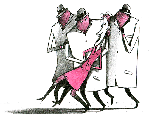 Картинка стала расплываться. Мориц принялся нервно крутить колёсико настройки, но улица погрузилась в серый туман. Мориц снова поднёс золотистую трубу к глазу. Он увидел письменный стол и учебник по естествознанию. Улица исчезла. Мориц растерянно опустил трубу. Пока он размышлял о случившемся, она снова засветилась и чуть не прыгнула ему в руки. Он подхватил трубу и уставился в неё. Туман рассеялся, улица снова была видна, и «чёрные» мужчины возвращались. Но возвращались не одни. Они вели перед собой маленькую изящную женщину, которая изо всех сил упиралась и вырывалась из их цепких рук. У Морица перехватило дыхание. Он разглядывал это нежное существо, одетое во всё розовое. Она брыкалась и мотала головой так, что её длинные рыжие волосы хлестали воздух. По всей видимости, она при этом ещё и страшно ругалась, но, конечно, была бессильна против троих дюжих мужчин. Сердце Морица бешено заколотилось.