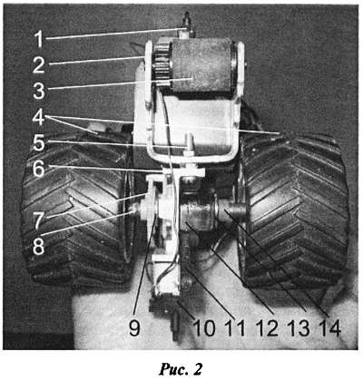 Шасси игрушки реализовано по «вертикальной схеме». Его конструкция имеет два ведущих колеса 4 (рис. 2), ведомое — опорное 3 (условно будем его считать задним колесом) и опорный зуб 11. Он нужен для предотвращения опрокидывания робота при резкой смене направления движения.