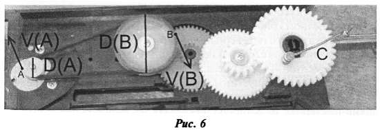 Нетрудно сообразить, что любая крайняя точка колёс любой взаимодействующей пары движется с одинаковой по модулю линейной скоростью (V(A) = V(B)). В противном случае колёса проскальзывали бы друг относительно друга, чего в исправном редукторе не бывает. Пока точка В совершит один оборот точка А сделает примерно три, ведь пути точек из-за равенства скоростей одинаковые и длина обода шкива А в три раза меньше длины обода шкива В. Такое же соотношение имеют диаметры пар колёс. Вывод: во сколько раз диаметр одного взаимодействующего колеса, больше диаметра другого, во столько раз меньше частота его вращения по сравнению с частотой вращения другого. То есть первая пара (рис. 5) понижает частоту вращения втрое, вторая грубо тоже втрое, третья и четвёртая так же. В итоге редуктор снижает частоту вращения шестерни С (рис. 6) в 81 (перемножение получившихся отношений) раз по сравнению с частотой вращения вала (шкив А) мотора. Более точно передаточное число находится при измерении диаметров шестерён и шкивов (колёс) штангельциркулем и вычислении на калькуляторе их отношений.