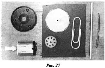 Сначала вставляем шестерню 3 в шестерню 1. Фиксируем каплей клея. Затем одеваем с усилием шестерню на вал 4. Разрезаем пластмассовое основание на две части 2 и 6, лишнее выбрасываем. Навиваем проволоку канцелярской скрепки на вал 4, получаем некое подобие катушки соленоида с выводами. Откусываем лишнее, оставляя длину 5–6 мм. Сверлим в верхней части пластины 2 пару отверстий под крепление детали 5. Вставляем её в основание, вставляем в неё вал 4 с шестерней 1, предварительно надев отрезок ПВХ трубки в качестве ограничителя 10. ВДВИГАЯ И ВЫДВИГАЯ ЭЛЕМЕНТ 5 В ОСНОВАНИЕ, МЫ ПОЛУЧИЛИ ВОЗМОЖНОСТЬ РЕГУЛИРОВКИ ЗАЗОРА МЕЖДУ ШЕСТЕРНЯМИ В РЕДУКТОРЕ. Далее сверлим по месту отверстие под ось 9 в торце пластины 2. Вклеиваем ось и ставим шестерню 8. Регулируем сцепление зубьев элементом 5 и так же фиксируем его на клей. Приклеиваем по месту мотор 7 к основанию 6. И УЖЕ ЗАТЕМ, ОПЯТЬ ЖЕ ПО МЕСТУ, СОЕДИНЯЕМ С ПОМОЩЬЮ КЛЕЯ ОСНОВАНИЕ 2 И ОСНОВАНИЕ 6, РЕГУЛИРУЯ ОДНОВРЕМЕННО ВЕЛИЧИНУ СЦЕПЛЕНИЯ ВИНТА И ЗУБЬЕВ ШЕСТЕРНИ.