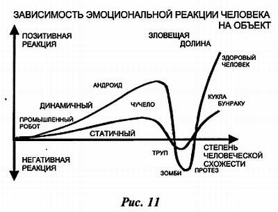 Если верить Википедии, то реакция людей на внешний вид «умных машин» весьма неоднозначна. Так в 1978 году японский ученый Масахиро Мори провел опрос, исследуя эмоциональную реакцию человека на внешний вид роботов. Поначалу результаты были ожидаемыми: чем больше робот похож на человека, тем симпатичнее он кажется — но лишь до определённого предела. Наиболее человекоподобные роботы неожиданно оказались неприятны людям. Мелкие несоответствия реальности, вызывали чувство дискомфорта и страха. Неожиданный спад на графике (рис. 11) «симпатии» и был назван «Зловещей долиной». Масахиро Мори обнаружил так же, что анимация или динамичное поведение усиливает и позитивное, и негативное восприятие. К счастью, наша поделка находится далеко слева от «зловещей пропасти».