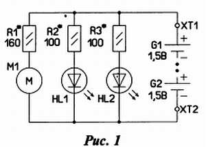 Резистором R1 устанавливают частоту вращения вала электродвигателя M1, а резисторами R2 и R3 — яркость свечения светодиодов. Питается устройство от двух гальванических элементов (типа: LR 44, AG13, 357). Подача питающего напряжения осуществляется установкой этих элементов в самодельный держатель, образованный контактами ХТ1 и ХТ2.