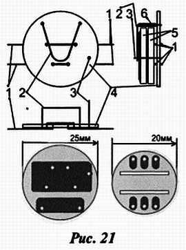 Конструкцию сувенира поясняет рисунок 24. Подвижная часть состоит из оси вращения 11 (отрезок стальной проволоки диаметром 0,5–0,7 мм и длиной около 6 см), перекладины 10 из того же материала и двух стержней 9 с шариками и шарнирами на концах. Декоративные элементы 12 выполнены из медной проволоки ПЭЛ-0,35 и приклеены к стержням «секундным клеем». Ось вращения 11 соединяется с двигателем 7 посредством отрезка изоляции 8 (длина 10–12 мм) тонкого 3 мм (дно компьютерной клавиатуры). Сама рамка приклеивается к кольцу — основанию 2. Внизу к рамке приклеивается контактная панель 13 — прямоугольный отрезок фольгированного гетинакса. Выводы двигателя с панелькой соединяют витой проволокой 5 (ПЭЛ-0,15 намотанная на стержень-оправку диаметром 3 мм). Готовый маятник приклеивают к основанию 3 (оргстекло толщиной 4 мм и размером 30х105 мм). Снизу в углах приклеены четыре «ножки» 1 (отрезки резиновой трубки из привода автомобильного CD-проигрывателя).