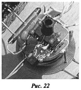 Плата 4 с смонтированными элементами и проводными выводами к контактной панели 13 также приклеивается к основанию 3 через четыре резиновые опоры 1. В заключение производится электрическое соединение платы и двигателя маятника (панелька 13).