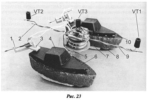 Если один двигатель вращается быстрее второго, кораблик станет поворачивать в сторону. Чтобы устранить этот недостаток более «быстрый» двигатель можно развернуть к внешней стороне кораблика на 15…45 градусов или параллельно выводам виброзвонка подключить резистор сопротивлением 130…220 Ом, а последовательно — резистор сопротивлением 10…24 Ом. Осадка и крен вперёд или назад можно выровнять наклейкой на дно дополнительных поплавков 7 или балластных металлических шайб 8. Соответствие направления движения даваемым командам устанавливают экспериментально подключением подводящих проводов к виброзвонкам.