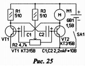 Работой двигателя M1 управляет мультивибратор, реализованный на транзисторах VT1, VT2. Резистором R2 регулируется длительность и скважность импульсов тока, питающих двигатель, а следовательно скорость вращения маятника и угол отклонения шариков.